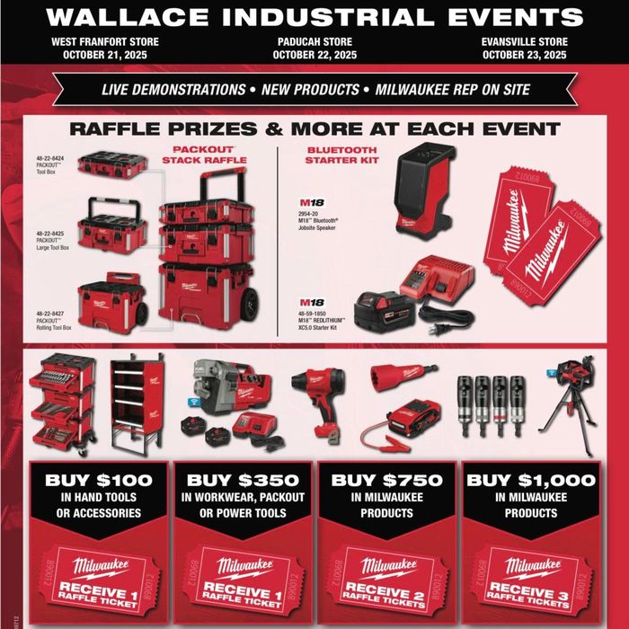 GET READY, PADUCAH! Wallace Industrial Tools and Supply is celebrating with a Milwaukee Tool Event you don't want to miss! Join in on Wednesday, October 22nd, from 10am to 3pm at Kentucky Oaks Plaza (Betweek Hobby Lobby and Boot Barn). Meet with the Milwaukee rep, see live demos, explore new products, and experience the largest Milwaukee Tool selection in the area! It's all happening at Wallace Industrial Tools and Supplies - Where hard work meets the right tools. JC & Ken will be there from 11am to 1pm. Be sure to stop by!